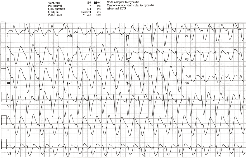 A 48-year-old woman presents two days after Thanksgiving with severe weakness, palpitations, and mild chest discomfort. Her ECG appears to show a very wide complex regular tachycardia at 119 bpm.