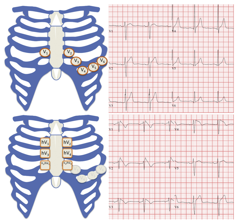 (Top) Standard-lead ECG positions and corresponding precordial ECG in a patient with BrS. (Bottom) High-lead ECG positions and corresponding ECG in the same patient. Note that hV5 and hV6 on the high lead ECG correspond with V1 and V2 on the standard-lead ECG, showing the improved sensitivity for diagnosis with change in lead placement.