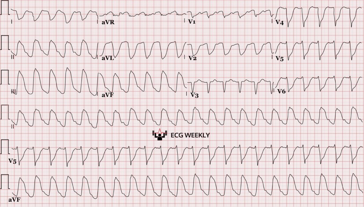 A 40-year-old man presents with chest discomfort and shortness of breath. He’s ashen, diaphoretic, and hypotensive at 90/45. The ECG monitor shows a wide-complex regular tachycardia at 135 bpm concerning for ventricular tachycardia. Your team prepares for cardioversion, while you review the following ECG obtained on arrival: