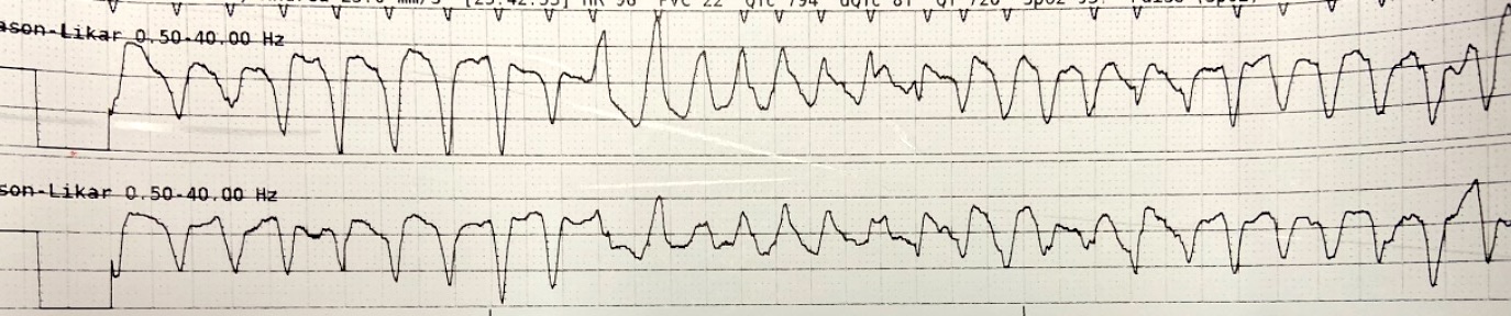 This matters because T-wave alternans is one of the strongest ECG predictors of impending torsade de pointes and sudden cardiac arrest. Minutes later, the patient develops polymorphic ventricular tachycardia consistent with torsade, intermittently self-terminating.
